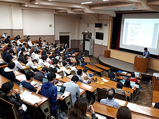 授業が終わると次の授業の学生さん十数人が入ってきて、その中に青山君が。彼に「何を急いでいるの?」と訊くと、「早く来ないと、いい席が取れないんだ」と。