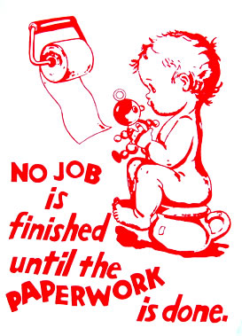 そしてその絵には「No job is finished until the paperwork is done」と記してあったと。