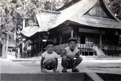 写真1:61年前に南陽市の熊野大社前にて、筆者(右:6歳)と弟(左:4歳)