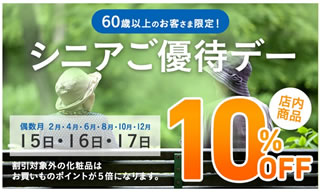 近所のドラッグストアでは月に1日ですがシニア10%割引きの日があり、値の張るものはその日に買っています。何かとシニアは優遇されています。