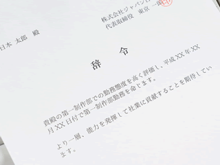 辞令をして「紙切れ1枚云々」などと言いますが、少なくとも私が勤めていた会社では、辞令は少し厚みのある紙に印刷されていて、普通の文書類とは趣が異なり、紙切れと言うのは失礼な程度の重みはありました。