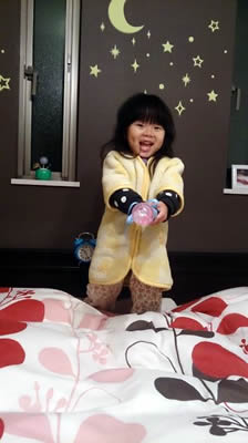 写真撮影前、かりんのほうの右下の手まり、花の真ん中の玉子がない!「つまみ食いした!?」と聞くと「フフフ」のかりん笑。