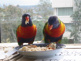 普段はロロキーに餌をあげないのですが、雨宿りに来ていたロロキーが寒そうに鳴いていたので、薄めた蜂蜜をパンにしみ込ませた餌をあげました。(この後はやはりジャングルのようになってしまい、半日位うるさかったです。)