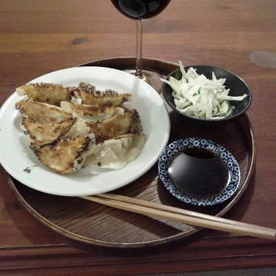 今夜の晩酌。手作り餃子、フェノーサラダ(今回はズッキーニとフェノー)ワイン(Shiraz Cabernet)