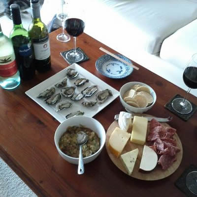 昨夜はシェアメイトと友人とで飲みました。Cheese & Cracker,Salami,Oyster with White radish Ponzu Sauce, Red & White Wine.