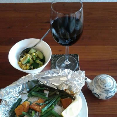 今夜の晩酌。魚(Ocean perch)と野菜のホイル焼き、キュウリとコーンの生姜醤油和えサラダand Wine.
