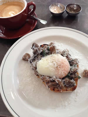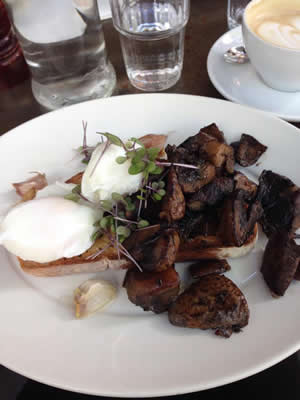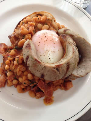 半熟卵とソーセージにビーンズ、下は何だろう・・お肉とキノコのソテーかな?