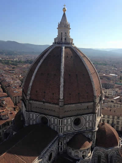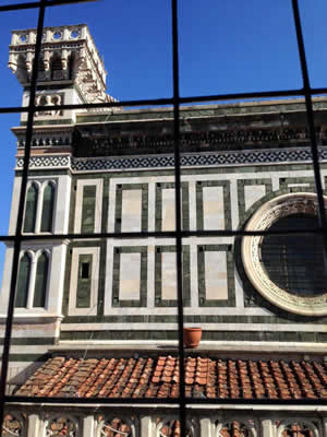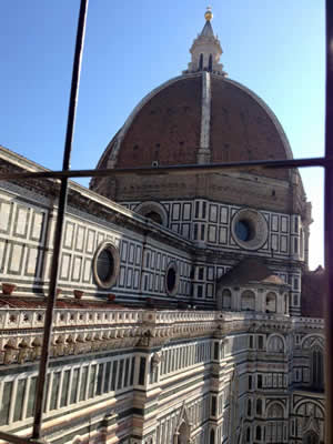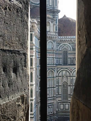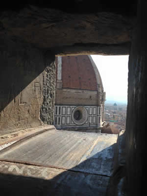 下の左の写真は、鐘楼の真北に見えるドゥオーモの西はじ最上階。右の写真は、小窓から見えるドーム部分。
