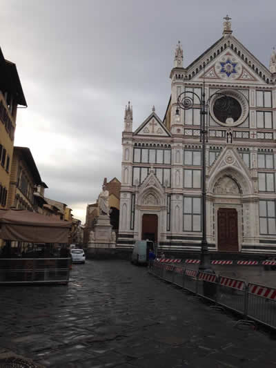 まず最初はサンタクローチェ教会。シニョーリ広場からグレチ通りを真っ直ぐ東に向かって行くと白いファザードの教会が見えてきます。