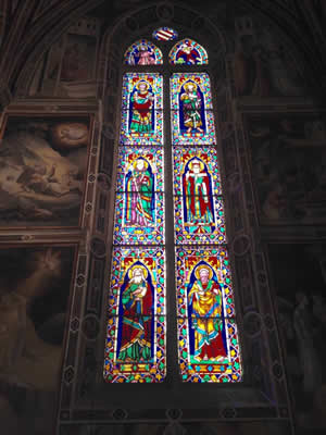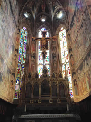下は正面の十字架像に近づいたところ。これはジョット派のアニョロ・ガッディの作品。両側の壁には「聖十字架伝説」をテーマとした14世紀のフレスコ画が描かれている。