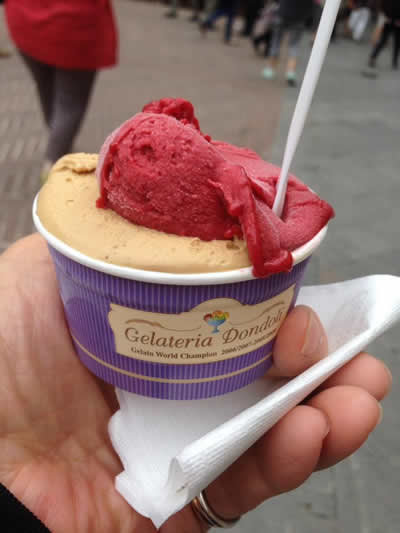 このコンビではなく、この店のジェラートが何度か世界一になったそうです。これは上がミックスベリーのシャーベットで下はコーヒーです。濃厚でした。