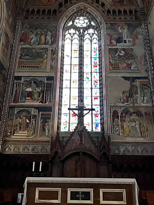 シニョレッリの壁画は大聖堂内部のサン・ブリツィオ礼拝堂(右)にある。かのミケランジェロがシニョレッリの作品を絶賛していて、彼の代表作の一つシスティーナ礼拝堂の「最後の審判」はこのシニョレッリの壁画に着想を得たとされている。