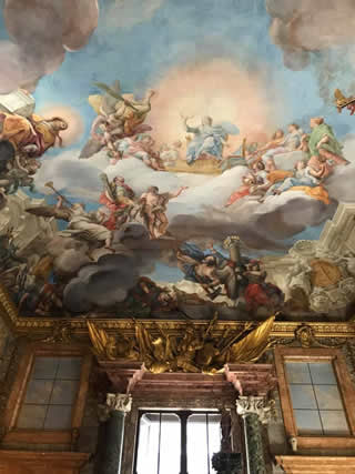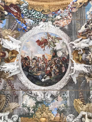 このギャラリーは1571年のレパントの海戦でトルコ軍を打ち破ったキリスト教連合艦隊の大勝利を賛美する目的で造られたもの。その司令官でもあったマルカントニオ・コロンナ2世の様々な栄光の瞬間が天井画に描かれている。