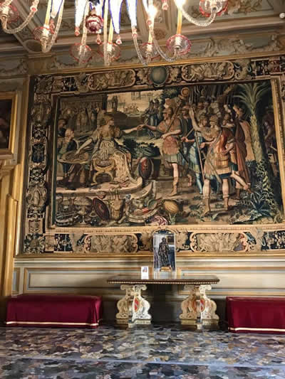 下は、礼拝堂の間にあるつづれ織り。17世紀に織られたものだね。この部屋に掲げられたつづれ織りの絵柄はアルテミジア女王にまつわる一連の物語がテーマになっている。