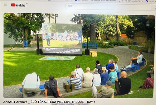 そのプロジェクトの一環として、24日と25日の2日に渡り、LIVE THEQUEが開催された。会場は、セーケイ国立美術館の中庭で、フェスティバルの象徴として聖アン湖のほとりに設営されてきたビッグテントが再現され、横に置かれた大きなスクリーンで、当時の参加者のトークがZoomで紹介された。