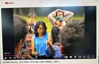 ディレクターのグスティ(Ütő Gusztáv)と並んでスクリーンに映り、28年ぶりの再会を喜び合った。 私はパフォーマーではなく、この「リビングアート・フェスティバル」に、インスタレーションを設置する計画だったけれども、作品の安全のためというグスティの助言により、パフォーマンスのときだけ見せることにし、急遽このように夫とのひと連なりの表現に。