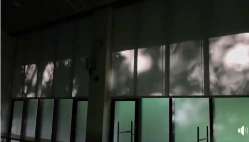 【2018/5/5】 昨日の板橋区立美術館、ホールからの眺め。 このガラスの壁面からは一面の林が見えて、夕方には木漏れ日が床に差し込み、イタビのなかで一番好きな空間だった。 蔓が巻き付いたワイルド感が気に入っていた。 このホールで数回展示させていただいた。 今はスクリーンがかけられていたが、思いがけずに遭遇した、木立に吹く風の現象がおもしろかった。