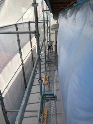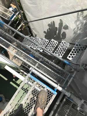 【2018/7/26】 補強工事 5月末から補強工事を開始した我が家は、足場と覆い幕に2ヶ月間包まれている。 足場が必要な工事は今回で人生最後にしたいので(これ以上はムリ…)、職人さんがいない日曜日や朝に足場にのぼり、高所も入念に見て回る。 工事用足場は、スリリングなジャングルジムみたいだ。 すべてを見下ろす視界と、普段は見れない部分に近づけるのは、なかなか楽しいし気持ちがいい。 二階の固定窓には、蜂の巣とカマキリの卵がついていた。 飛散防止幕と塗装用の養生シートで二重に覆われた自室の3面の窓越しに、足場を移動する影、作業する影、作業の音。