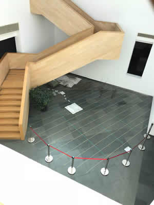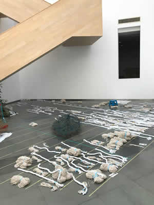 【2018/11/1】 作品制作 3日のオープニングに向けて、朱家角人文芸術館で作品制作を続けている。 床面には、ロープで世界の水害のデータを紀元前まで遡って記す。 データは、海面の白波のように広がり、そこに、あらゆる生き物を象徴する木の葉が漂う、という予定。 今日は、ようやくデータの配置が終わり、ロープの束が所定の位置に置かれた状態。 この後、激変することになるのだが、今はどう見てもゆでる前のラーメンにしか見えなくて、お客さんもニヤリとする。 大学の学生が会場つくりをお手伝いに来ている。