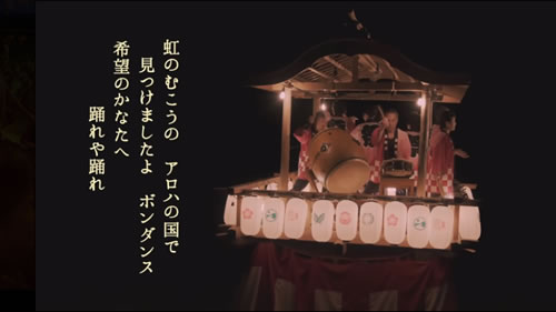 ラストシーンは、時空を超えた幻想的な、いろいろなイメージを想起させる秀逸な表現だった。 暗がりに浮かぶやぐら。ハワイに双葉盆唄を伝えた横山さんたちが太鼓や笛の奏者や唄い手として、やぐらの上で双葉音頭を奏でている。 そして、やぐらの下は深い暗がりで見えないけれど、ハワイの踊る人々のざわめき、陽気なかけ声が聞こえる。 これは、横山さん達がこの世からいなくなっても、ハワイには双葉盆唄がしっかりと受け継がれ、それが双葉町に再び伝えられる日がきてほしい、きっと来る、そんな祈りのように思えた。