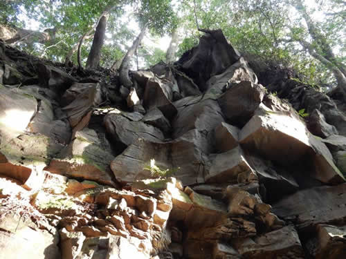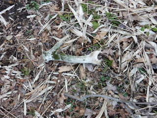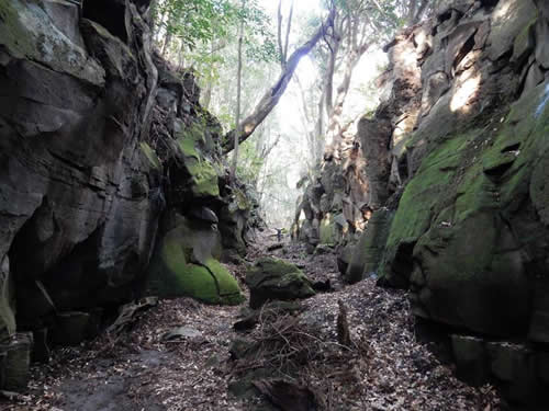 なんの説明もなかったけれど、神話の香りがした。 マップをたよりに友人と行ってみて、針金で簡易に閉じてあるフェンスの扉からドキドキして歩み入ったそこは、私の「とっておきの場所」になった。 今回、長崎県で展覧会に参加するのをきっかけに九州に行き、また感動を味わいたく、夫にも見せたいと思い、再訪した。 フェンスの中の林を過ぎると、高さ10メートル程の岩壁にはさまれた谷の形状が現れる。両壁の上には樹木が茂り、まるで水が消失した峡谷の川底にいる印象だ。 太い倒木が上の森から転落したままの姿で苔むしている。森から実が降ったらしく、「川底」にも若木が育っている。 鹿の角が落ちていた。神様の落とし物のように見えた。 都城市のサイトによると、