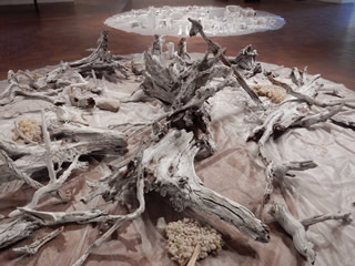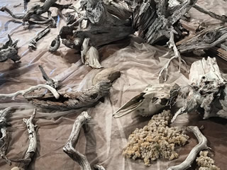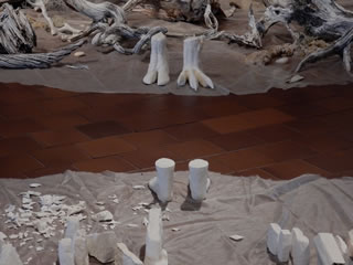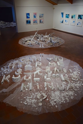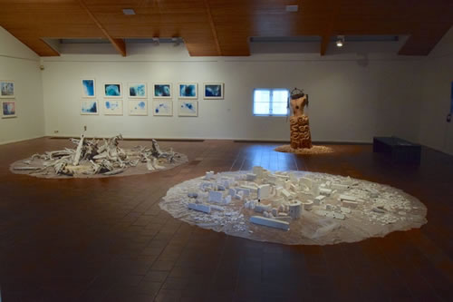 私のインスタレーションが、連結する3会場の中央スペースの真ん中になり、全参加作家が発するものを受け止めるような構成となった。 向き合う2つの円は、人間の世界と人間以外のあらゆる生物や存在を表している。 隣接する3つのスペースには、人、けもの、魚、蝶、ミステリアスな存在、人間の心理、日本の祭りや鹿踊り、東北を襲った災害にまつわること、現象、などなどが表現のなかに取り込まれており、会場を歩き廻るとそれらが互いに響き合っていく。 災害を繰り返し経験している私たち。地球に存在するささ やかな生き物の一つとして、人間以外の存在について、も っと知りたいと思う。 人が住む街を3ヶ国語の文字で表現し、ヒトから、そのよ うな存在に向けてのコンタクト。 CAN YOU HERE ME? きこえるかい?KUULETKO MINUA? Spirit of 'North’ vol.10: Sensing Faint Resonances