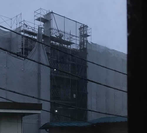 【2019/10/12】 建築現場 窓を打つ激しい雨。すぐ近くに建築中の現場から物が飛んでこないといいな…心配で見上げてみると、この暴風雨の中、作業する人影が! 私にとっては、今後の視界を遮ることになる歓迎できないビルながら、働く人には同情する。 転落しないように、気をつけて!