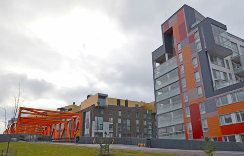 新しい街づくりの環境設計は、モダニズムの良き部分がき ちんと継承されている。 構造が持つフォルムと色彩が一体 化しているので、全体が美しく落ちついて感じられる。 表層の記号(例えば広告看板など)がはじめに目に飛び込んでくることに慣れてしまいがちな眼には、あらためて新鮮 に映る。