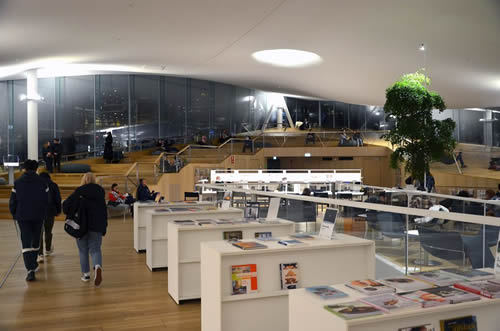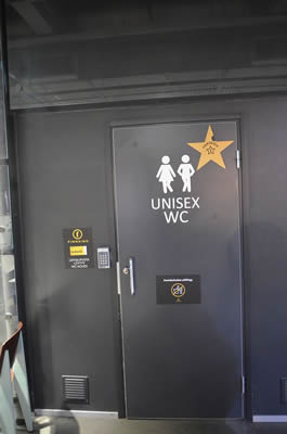 Oodi(ヘルシンキ中央図書館) 老若男女自由に夜8:00まで気軽に使える。普通の図書 館の機能を拡張し、ミーティングルーム、映画、ワークシ ョップルーム、PCなど様々に使える。誰でも大判プリン タや3Dプリンタも自由に使える環境は羨ましい。 こちらの公共のトイレで時々見かけるユニセックストイレ 。扉を開け階段を降りると広いホール状の空間で、個室トイレのドアはスリガラス。 使用者のシルエットが少し映るのでびっくり。でもこのニュートラルでオープンな感覚もすばらしい。
