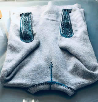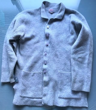 【2021/1/3】 リフォーム 闘病中には、腕が下にぶら下がった状態から、わずかしか動かせなかったため、服の脱ぎ着にはとても難儀した。 その状態で着られるのが、だぶだぶ大きくて伸縮するはおりもの。そんなわけで、もう30年も着ているカーディガンがとても重宝した。 毛玉ができて、肘部分は薄くなり、薄汚れているけれど、「まあ、入院で着てから処分かな…」と、入院用に持参した。 病院の洗濯機はガンガン洗うタイプだったので、このカーディガンもみごとに縮み、私にぴったりサイズに変身した。 フェルト化してさらに暖かくなったカーディガン。私の再生を見届けた相棒として、リフォームして着続けよう! 捨てるつもりだったので、遠慮なく気ままな遊び心で毛糸を刺し入れ、リフォームしたのがこれ。多分、終生着られると思う。 【2021/1/4】 背守り 日本には「背守り」という習俗があったらしい。 子供の着物の背の部分に、縫い飾りや飾り物をつけることで、幼子に災いがかからぬように願うまじないだそうだ。