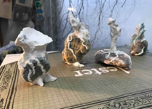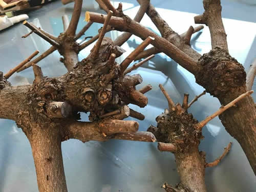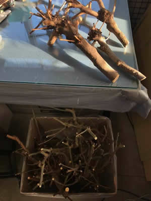 庭木の手入れは、いつも自分でする。そこが庭作りの醍醐味だ。今の木々の状態をベストにするというよりは、10年後を見越して枝を整え、木々同士の関係をつくる。 これを学びたくて、私は30代のころ発作的に(?)造園業のアルバイトに飛び込んだ。その体験は、私をおおらかに野性的に変え、そして地べたから社会を眺めて、その底辺を支える人々を知った。やって良かったと思う経験だ。 もう昔ほど身軽に動けないから、梯子から転落して骨折などしないように、いくつかの庭木は、手入れしやすい高さに低く作り直そう。 柿とサルスベリとムクゲを、思い切り剪定した。 高い脚立を運ぶのも、枝をのこぎりで挽くのも、大丈夫!体調はすっかり回復したらしいことを、実感できてうれしい。 たくさんの剪定枝を処分するため、切りそろえていたら、木の瘤のかたちや、あちこち向いている枝の生命力が面白く、むくむくと表現意欲が湧いてきて、枝を捨てられない! 断捨離しようとしているのに、家の中が、またマテリアル予備軍でいっぱいになっていく・・・あ〜あ。