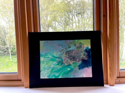 この滞在中に、Suから2021年の「精神の〈北〉へ」スコットランド開催を提案されて、相談が始まったんだなあ... あれから今まで、1年以上も感染に対する緊張の日々を耐えているのに、終息の見通しがたたなくて...過去の私が幸せそうにみえる。 悪いのは人間なんだけど、コロナめー!って言いたくもなる。 【2021/5/10】 良いことが3つ 郵便局が閉まっていたゴールデンウィークが明けてすぐに、スコットランドに送った私の絵画作品5点。 スコットランドのSuさんから、家に到着したと、この画像が送られて来た。 Suさんの家の窓辺だろう。