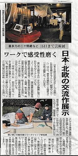 【2021/10/9】 「精神の〈北〉へ:ふたつの流れが出会うところで」・スコットランドとの交流展 日本とスコットランドの作家の4つのコラボレーションが、蔵の個性と共鳴しています。 16日の12:00まで、福島県喜多方市の3つの蔵にて。 この開催は、私のプロジェクト「精神の〈北〉へ/ Spirit of North」とスコットランドのSu Griersonがリードするプロジェクト「Confluence of North」が連係する共同企画です。 ◆床のインスタレーション:丸山芳子
