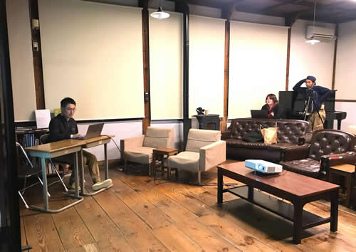 日本側は4名のアーティストが芸術村の各教室の会場を現場で紹介する方法をとることになり、スムーズな流れを作るために投影画像をみながら相談中。