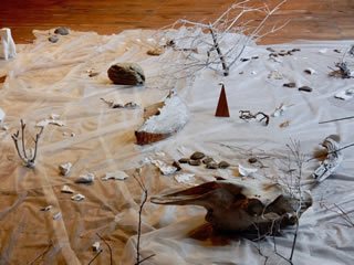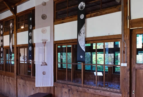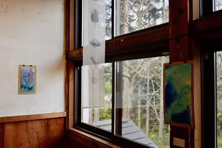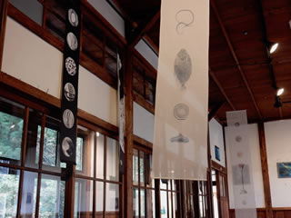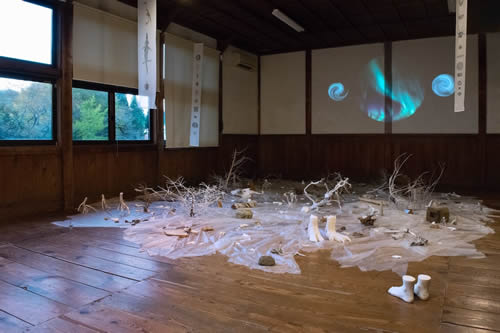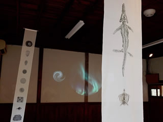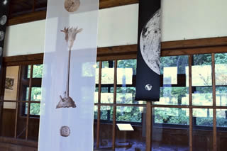 中央に表現した’森羅万象 More-Than-Human’を取り囲むのは、そのテーマで描いた絵画と、窓から見える現実の森羅万象。 installation & painting: 丸山芳子 MARUYAMA Yoshiko video & banner: カイラ・クレッグ Kyra CLEGG Kyra CLEGGのバナーにプリントされているのは、化石。 動植物が化石になるまでの遥かな時間。