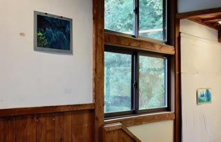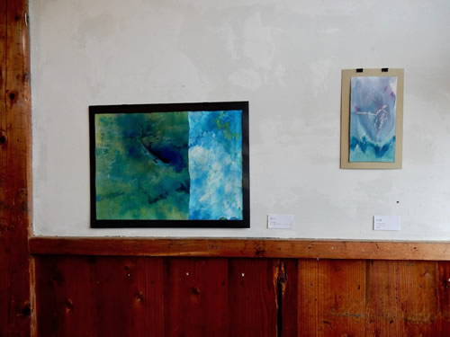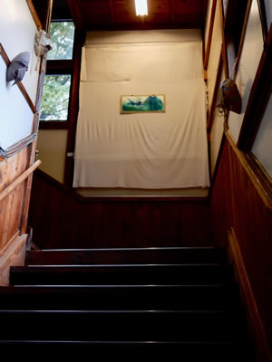 廊下や階段の踊り場にも絵を配置。 左:「沼にて At a Swamp」昭和村の沢の地図をとりいれている。