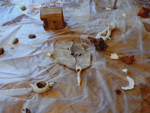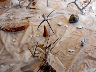 会津地方に伝承する「かしゃ猫」の絵がお出迎え。 自然物の素材で、見たことがない生き物をつくっています。