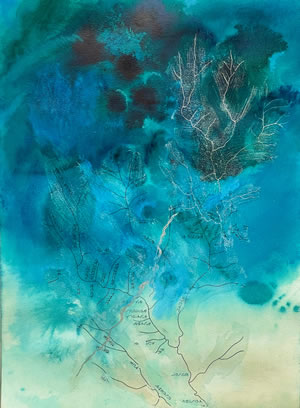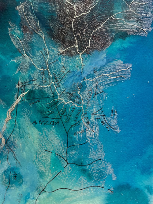 黒い線は、会津地方の昭和村の沢。 地域学研究者の菅家博昭氏が、村の猟師さん方に聞き取りして記録した、猟師しか知らない沢の名前。 【2022/6/5】 闇の横顔 泥沼の失敗作だけど、長いあいだ見捨てずにいた。 迷っている手探りの跡が、捨てがたかったから。 今日ふと思いついて、一部を黒で塗り潰したら、混沌も活かすことができた。
