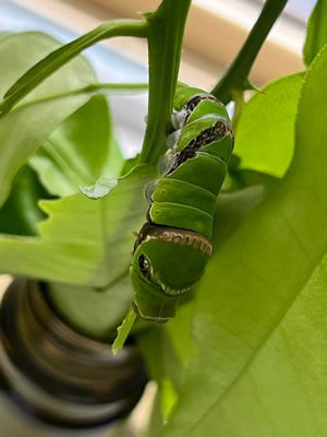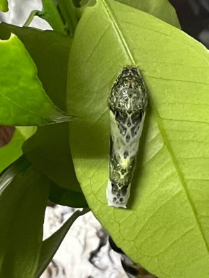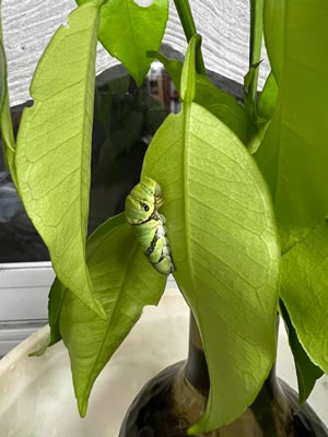 【2022/8/4】 クロアゲハの羽化 (虫が苦手な人は見ないでね) ユズの枝がぐんぐん伸びて、通行の妨げになってきたので、ちょっと剪定したのが事の始まり。 葉の裏に1センチぐらいのアゲハの幼虫がしがみついていたのだ。 この夏は忙しいからアゲハ観察はしないでおこうと思っていたけど。。。始めてしまった。 この幼虫は省エネの性格なのか、あまり動かず、あまり食べず。なのにぐんぐん大きくなってきた。 よく見るナミアゲハの若齢幼虫みたいに、白黒のイボイボではなく、つるんとして背中の模様がきれいなので、ひょっとして我が家ではレアなクロアゲハかもしれない。 頭をさわると嫌がって出す肉角が、オレンジではなく赤みがかっていたので、ますますクロアゲハの確率が上がる。 充分大きくなったので、白黒から黄緑の終齢幼虫になる脱皮を目撃しようと、昨日はちらちら見ていたけれど、何も食べずじっとしている。元気なのかどうか心配になる。 今朝見たら、脱皮が終わっていた。まだ淡い緑で初々しい。 色がみるみる濃くなって、からだつきもむちむちしてくる。体の模様、これは間違いないと思う。クロアゲハだ。 【2022/8/6】 絵のオファー ノルウェイで出会ったオランダの友人(サイエンティスト)が、FBで私の投稿を見て、作品2点を所望してくれた! どちらも、私自身がとても好きな作品なので、友人の選択眼に「いいね!」と共感する。