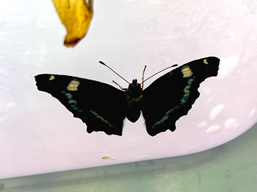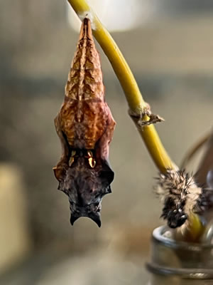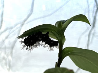 【2022/10/3】 ルリタテハ 庭の草花ホトトギスに何匹もの毛虫がたかって、葉を貪っている! 以前この植物を食べていた赤と黒の毒々しい毛虫のツマグロヒョウモンとは少し違う。夫がネットで調べて、ルリタテハとわかった。 これは、黒い羽に瑠璃色の帯がある美しい蝶だ。 羽化するまで観察してみることにし、前蛹化して茎にぶらさがっているのと、幼虫の2匹をホトトギスの茎ごと部屋に持ち込んだ。