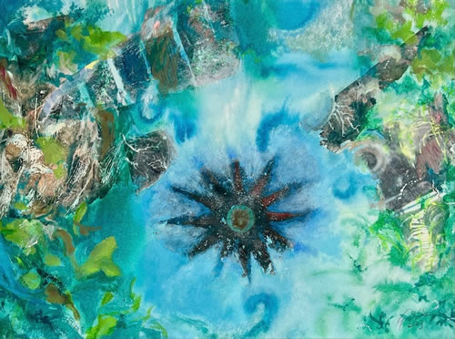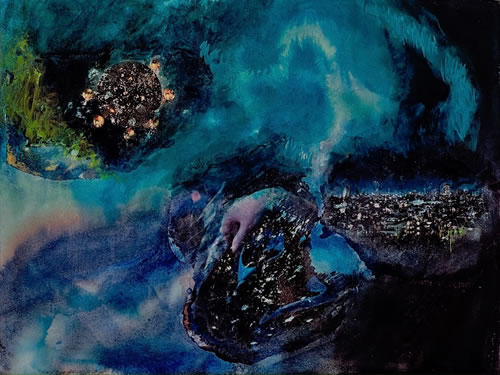◆作品:原生 / Primeval 私は転写技法を含む8点の絵画を展示しています。 最初に投稿したこの絵が、実物よりも黒すぎていたので、もう一度。。。でもやっぱり黒いみたい。 会場で実見するのが良さそうです。