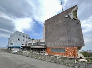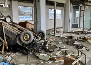 海からわずか150mの地にあった校舎は、高さ13mを超える津波と流されてきた物体の激突をまともに受けた。まるで防波堤のように。 海側の窓は破壊され、3階の教室に飛び込んだ車や、流れてきた冷凍工場に激突されて折れ曲がった4階の外壁から、すさまじい津波の威力をうかがい知る。