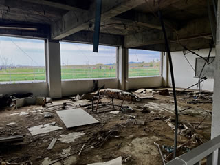 4階まで津波が及んだために人々が避難した屋上に立つと、ここから荒れ狂う津波を見ていた人々の心境が想像できた。 校舎の隣は、現在パークゴルフ場となり、人々が競技を楽しんでいる様子が、窓枠が外れてむき出しのコンクリートの窓穴から見える。 混乱と破壊を極めた教室内と、窓の外の麗らかな光景とが、12年のギャップをみせて感慨深い。 震災遺構の校舎と組み合わせて作られた伝承館では、掲示物や映像を見ることができる。 「気仙沼市階上中学校 卒業式」の映像は、津波から間もない日に行われた卒業式の、15歳の梶原くんの答辞が映っていた。 「苦境にあっても天を恨まず・・」と涙を振り払いながら語る姿。その後方では、おそらく被災してこの体育館に避難した人々らしき姿も映り、いっしょに聞いている様子。 未曾有の災害のなかで前を向いて生きていこうとする梶原くんの答辞に、大人たちも励まされ、掛け声と拍手が送られた感動の映像だった。
