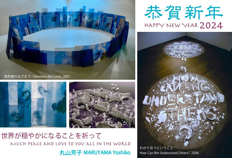 【2024/1/1】 「年頭のご挨拶」 Much Peace and Love to You All in the World! ・・・・・ 昨年から作品集をつくろうと取り組み始めて、初期から現在までの作品や、そのときの国内外での交流をなつかしく振り返りました。 そんな中で思うのは、20年以上昔の自分の作品が、現在の世界を見るようだな、ということ。 私たちの地球は戦闘や衝突の火種を方々に抱えたまま。時代は繰り返し、人間はいつの世も変わらない?いやいや、諦めたくはないですね。 これ以上、野望むき出しの愚か者に地球をかき乱されることがないように、 人々の良心が、世界を平和に近づけることができますように。。。