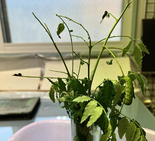 【2024/5/18】 「庭木を剪定したら」 個展準備の合間、ぐんぐん茂ってくる庭木を剪定したり枝すかしをするのは、気分転換に最適。 山椒の枝を切ったら、いつものようにアゲハ蝶の幼虫がついていた。忙しいから淡々と世話することにしよう。