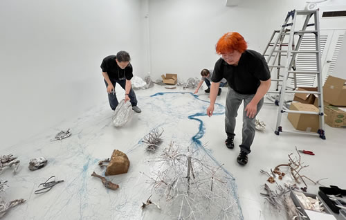 【2024/7/8】 丸山芳子展「雨の名前 / Written on Water」 会期中はほとんど雨のない猛暑の日々。 なのに、最終日の搬出時刻が近づくにつれて雷の音がゴロゴロと聞こえ始め、肝心な搬出のタイミングではとんでもないどしゃぶりに!! 私の日々の行いはそんなに悪かったのか?! そんな中、連れ合いのほかに作家の新井勝美さんと稲垣立男さんが搬出作業を手伝ってくださり、絵画とインスタレーションの2スペースの作品を1時間で運び出せました。