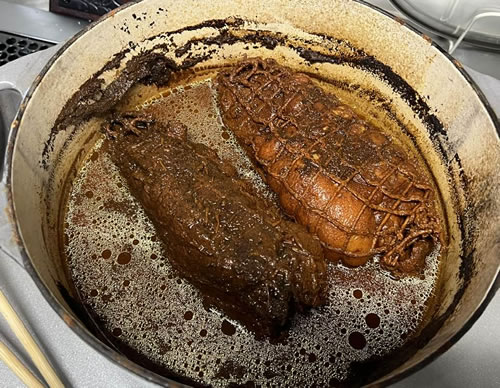 【2024/12/31】 「お正月を迎える準備」 20年前に義父が他界してからは、お正月を迎える準備は、私たち夫婦が都合のいいように省力化している。 だから、おせち料理は無理して作らずに、お雑煮と普段の料理で新年を迎える。 何でも高値をつけるこの時期なのに、豚肉のブロックが安価だったので、紅茶豚をつくる。