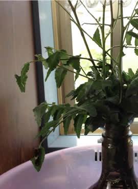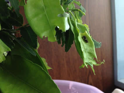 【2013/5/17】 左下のアゲハ若齢幼虫をからかった青虫くん、忽然と姿を消した。 葉の上に下痢の名残があったので、サナギになる場所を求めて旅に出ちゃったと理解した。 アゲハは変態の節目に、身を空にするために排泄するのだ。 さてさて、居そうな周囲を見渡してもどこにもいない。 それなら、気長に待ってみよう。部屋のどこかから、美しい蝶が現れるときを!