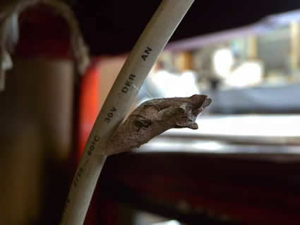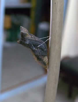 【2013/6/1】 ケーブルで発見してから数日後、サナギの色が黒ずみはじめ、夜になると濃くなった。 明朝の羽化のサインだ。