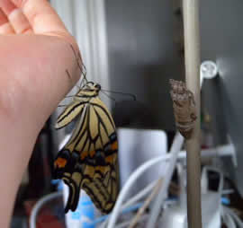 翌朝5時半、部屋に入ってみると、なんともう羽化が終わっていた?! 羽もすっかり伸びて…とても早起きなアゲハだったのでした。 飛び立てるように窓へ移してあげる。